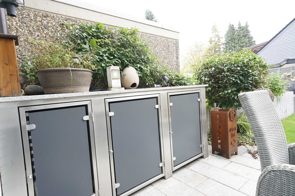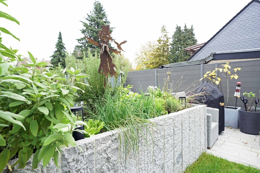 Der Garten wurde mit einem ansprechenden Hochbeet aus Granitsteelen, einem beheizbaren Teich (Oase-Teichtechnik) und einem Granit-Gartenschrank mit Regenwasserspeicher und Edelstahlverblendung ausgestattet.