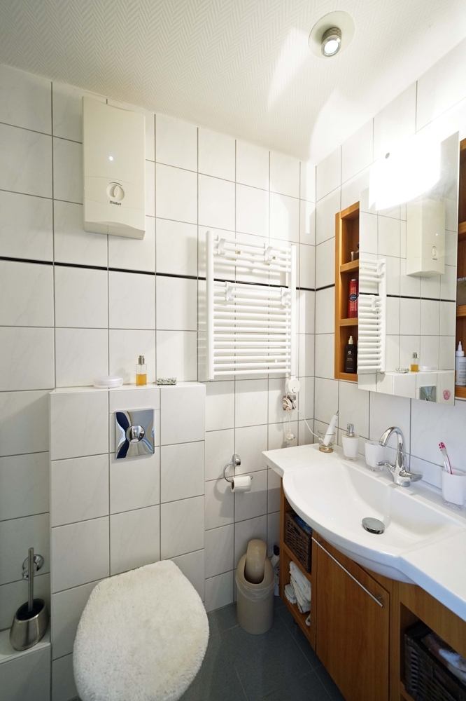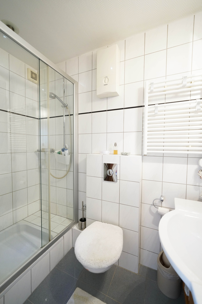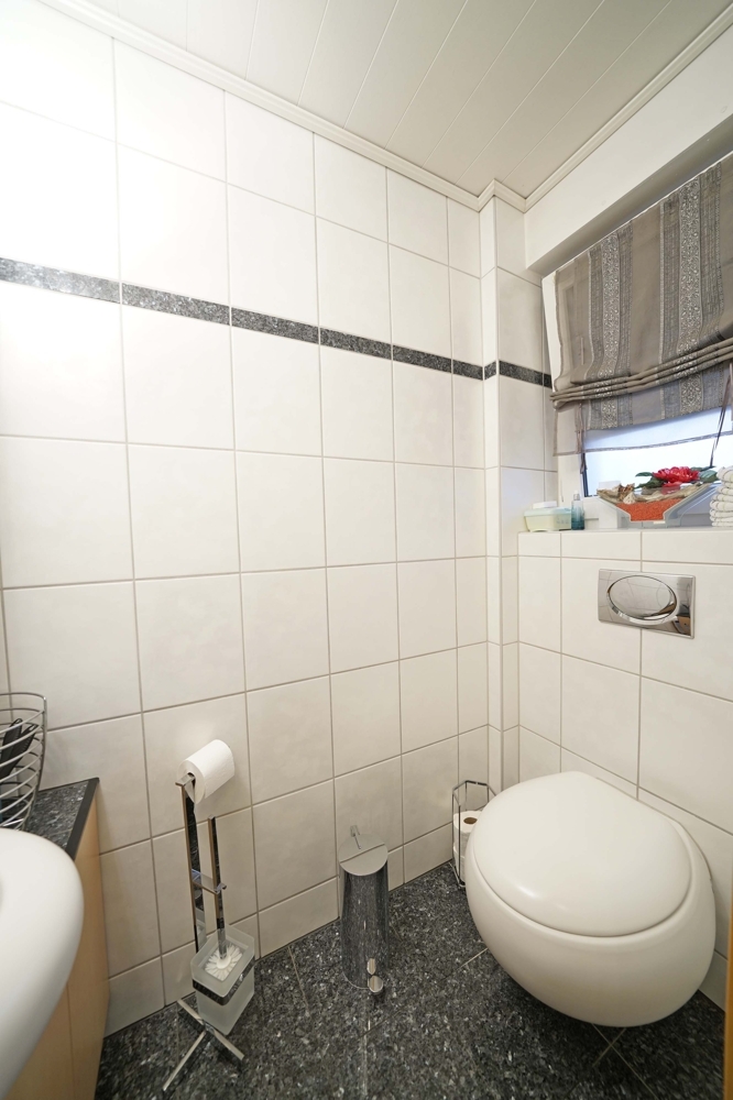 Auf der Eingangsebene findet man zunächst ein modernes Gäste-WC mit Fenster und deckenhohen Fliesen. Des Weiteren befindet sich hier die optimal geschnittene Küche, die direkt vom Flurbereich zu erreichen ist. Der Küchenbereich erschein hell und luftig.