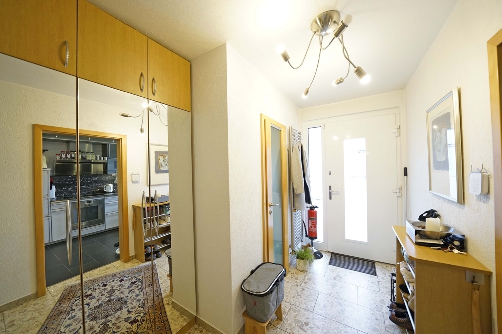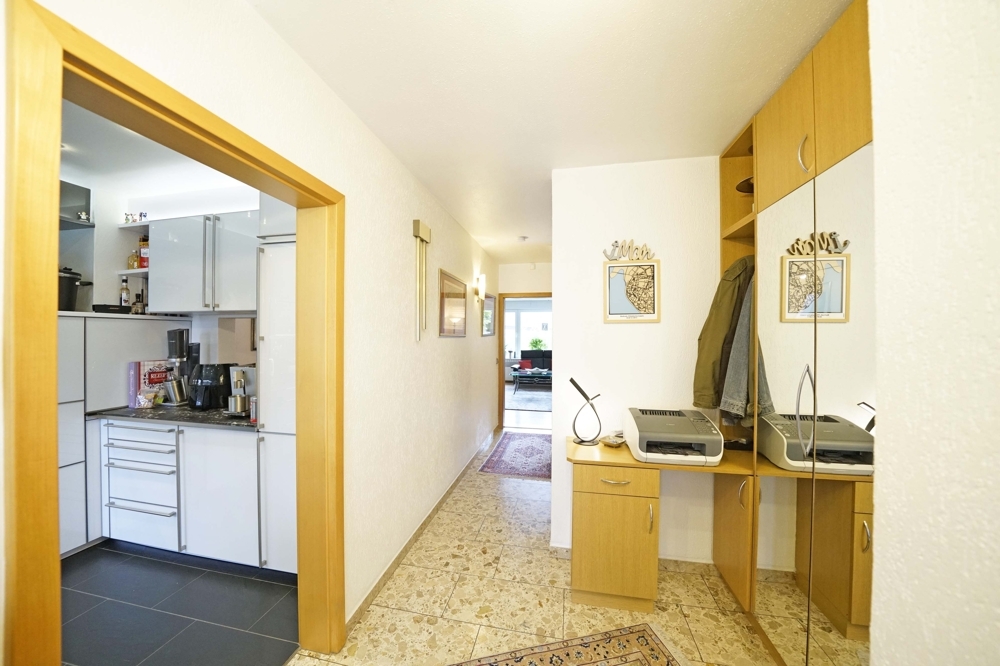 Gerade durch die Diele führt der Weg vorbei an einem perfekt angepassten Spiegel-Wandschrank zum großen lichtdruchflutetem Wohnraum mit Essbereich und Ausgang zum hübsch, mit viel Liebe, angelegten Garten.