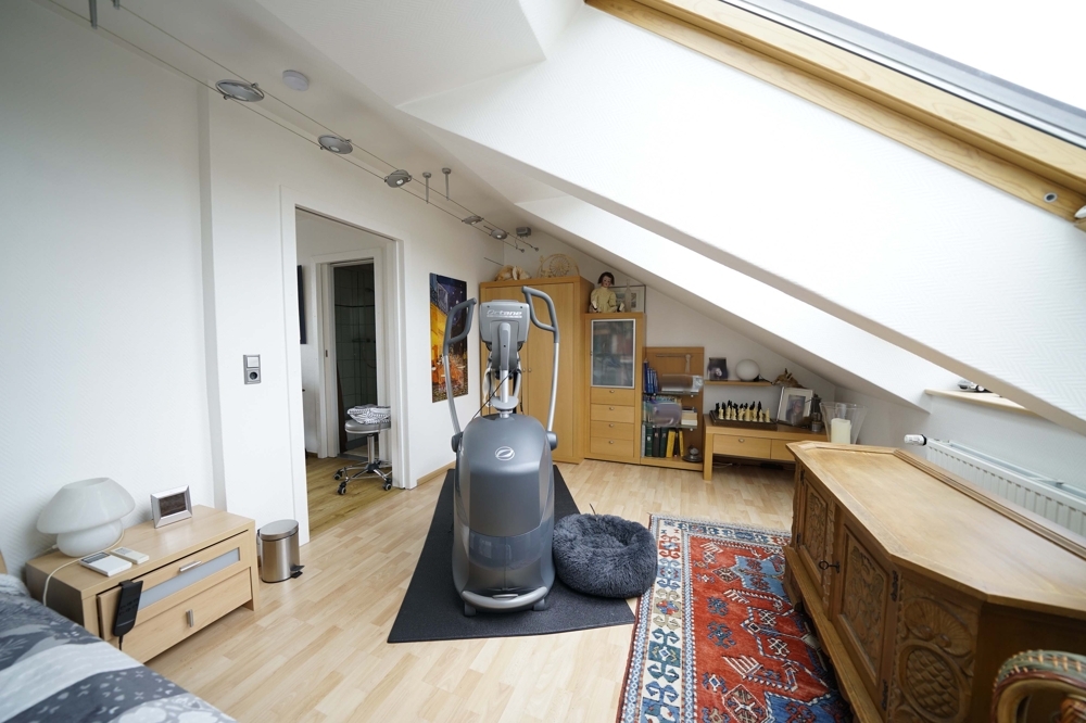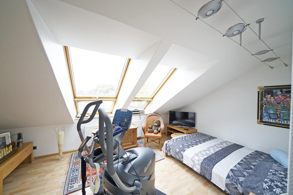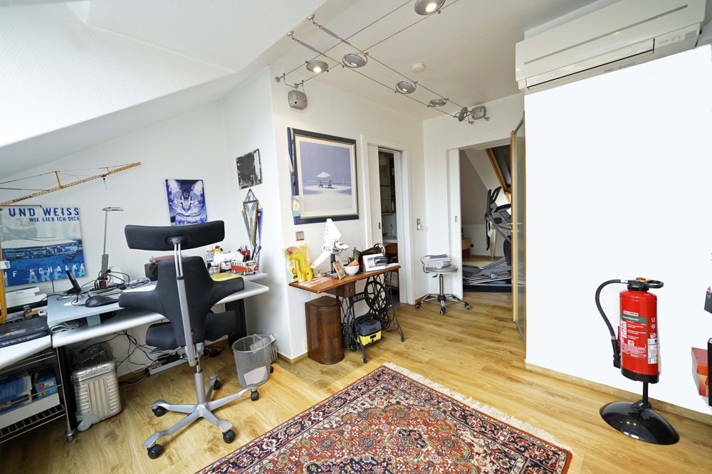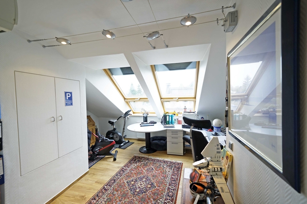Nach weiteren Treppenstufen hinauf stößt man auf das letzte und besonders bemerkenswerte Geschoss des Hauses. Das ausgebaute und lichtdurchflutete Dachstudio. Dieses Dachstudio beherbergt zwei Räume sowie ein eigenes Duschbad mit Handtuchheizung. Hier stehen Ihnen sämtliche Nutzungsmöglichkeiten offen. Ob Büro, eigener Rückzugsort oder wahrgewordener Traum für Ihre Kinder, dieses optimal ausgebaute Dachgeschoss bietet Ihnen sämtliche Optionen.