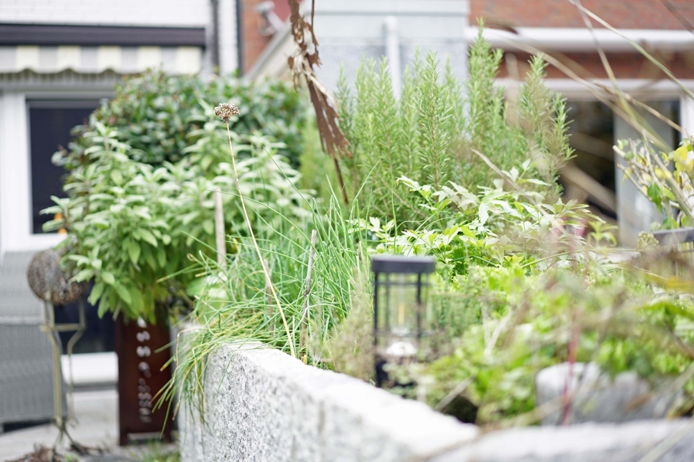 Ein wunderbar gestaltetes Hochbeet für die Küche und ein erstklassiger Gartenschrank mit Regenwasserspeicher rundet den hochwertig angelegten Garten ab.