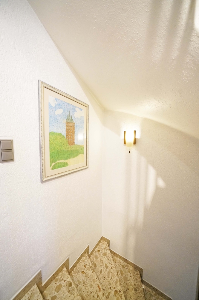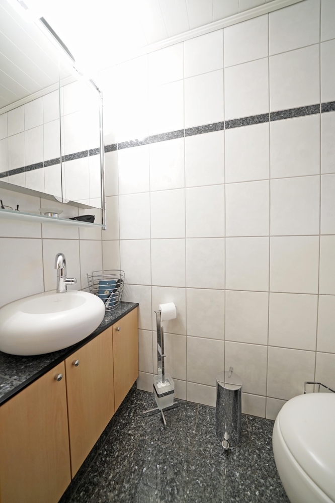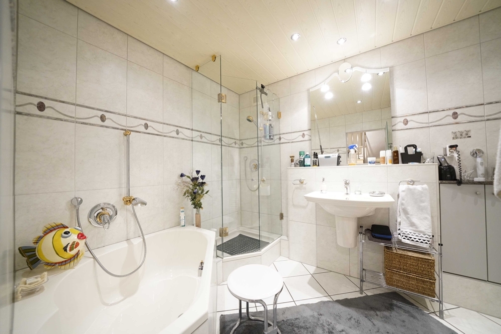Zurück ins Haus werfen wir einen Blick ins 1. Obergeschoss, dass wir über eine geschmackvolle Natursteintreppe erreichen. Auf dieser Etage finden wir drei schön geschnittene und helle Schlafräume sowie das großzügig geschnittene, deckenhoch geflieste Badezimmer mit Eckwanne und Dusche.
