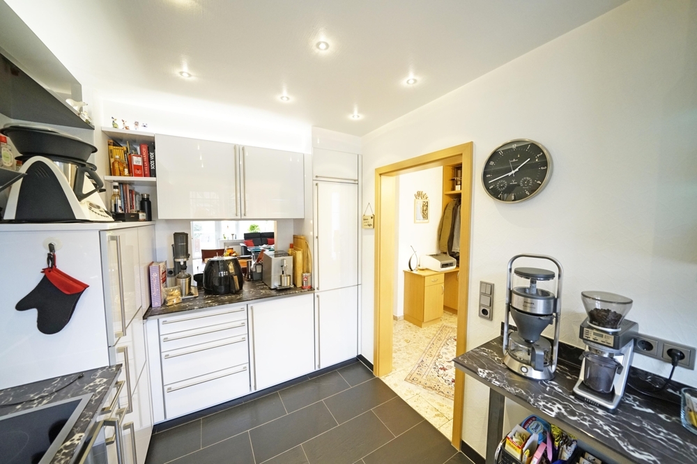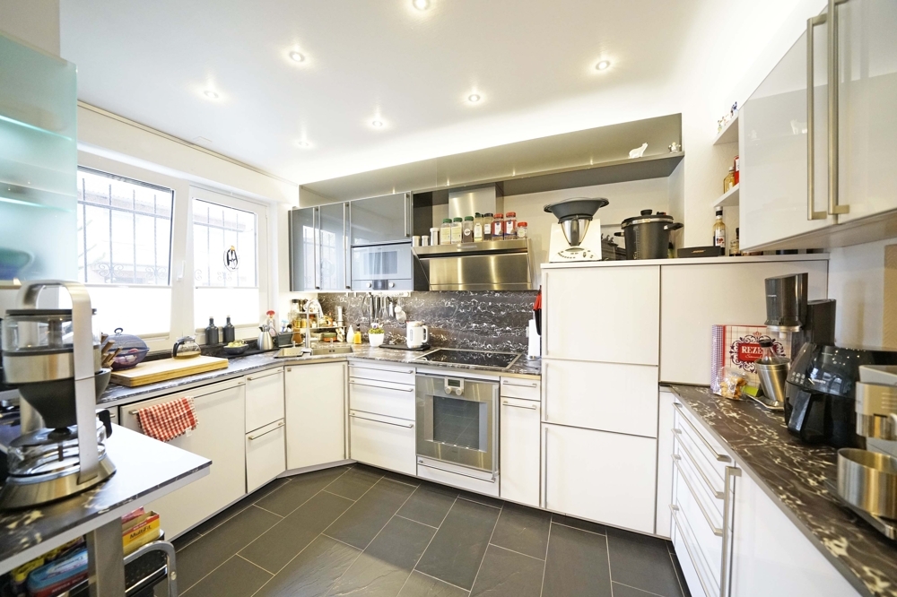 Die stylische und hochwertige Küche mit einer massiven und außergewöhnlichen Glasarbeitsplatte offeriert viel Platz für Stauraum und bietet zudem eine ideale Durchreiche zum Essbereich des Wohnraumes.