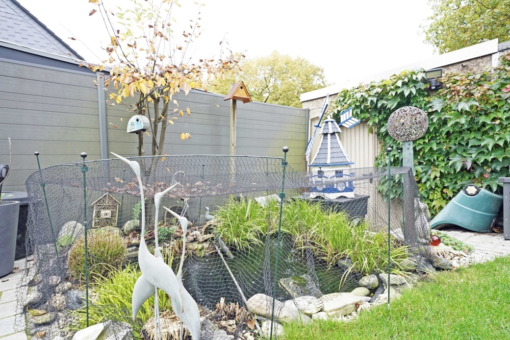 Im Garten erkennt man ebenfalls, dass dies eine kleine Oase ist, die bis ins kleinste durchdacht wurde. Über dem großzügig errichteten Terrassenbereich befindet sich die elektrisch betriebene Markise, die den Besuchern im Sommer Schatten spendet. Etwas weiter hinten im Garten finden Sie einen herrlichen kleinen Schildkrötenteich, der im Winter beheizt wird.